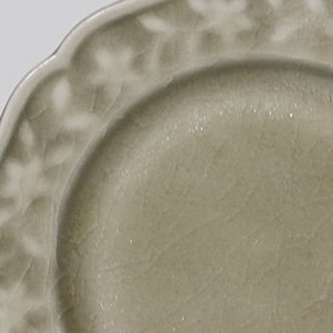 花冠を思わせるレリーフ模様が縁を彩るまめ皿です。