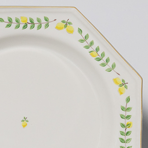 小さなレモン柄がぐるりと描かれた八角深皿。