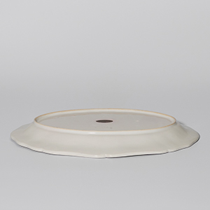 花びらのように柔らかなリムにオリーブの絵だとチェック柄が描かれたオーバル皿。