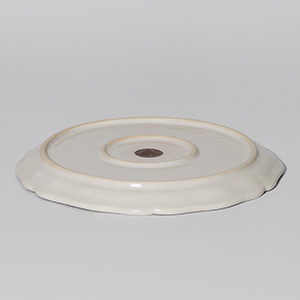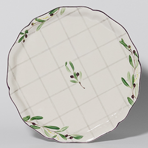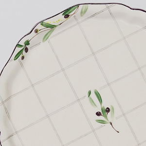 花びらのように柔らかなリムにオリーブの絵だとチェック柄が描かれた6寸リム皿。