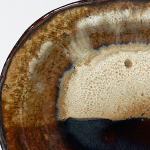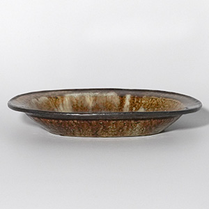 深みのある茶釉に白釉がやわらかく重なる、表情豊かな深型のオーバル皿です。