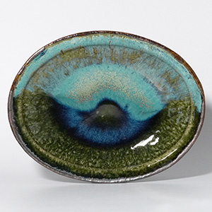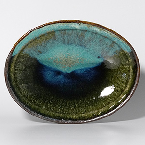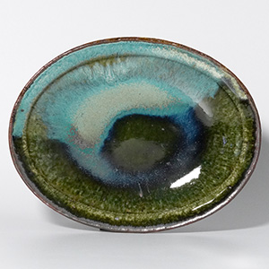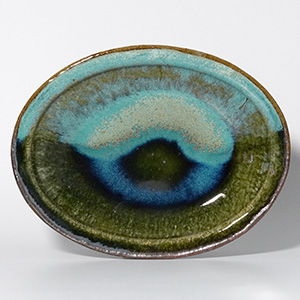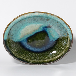 深みのある織部釉に白釉がやわらかく重なる、表情豊かなオーバル皿。