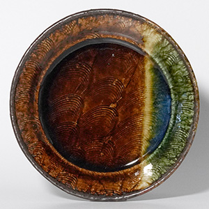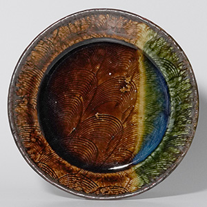 織部釉の透明感ある緑と、茶織部の温かな深みが美しく調和した掛分の深型リム皿。