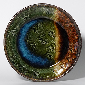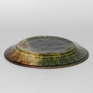 織部釉の透明感ある緑と、茶織部の温かな深みが美しく調和した掛分の深型リム皿。