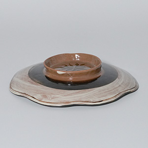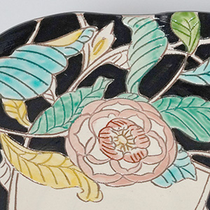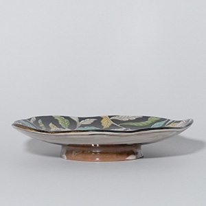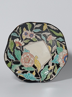 インド更紗の色彩や異国情緒をモチーフにしたオリエンタルな雰囲気の上絵付けの変型平皿。