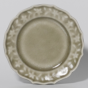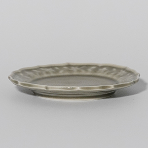 花冠を思わせるレリーフ模様が縁を彩るまめ皿です。
