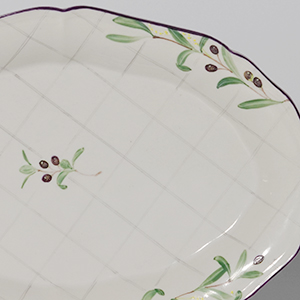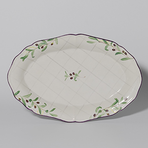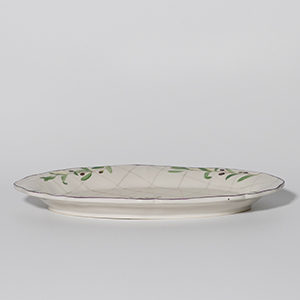 花びらのように柔らかなリムにオリーブの絵だとチェック柄が描かれたオーバル皿。