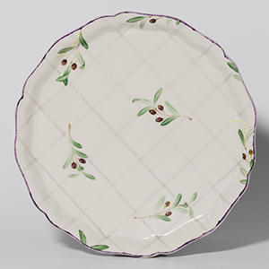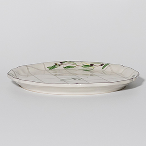 花びらのように柔らかなリムにオリーブの絵だとチェック柄が描かれた6寸リム皿。