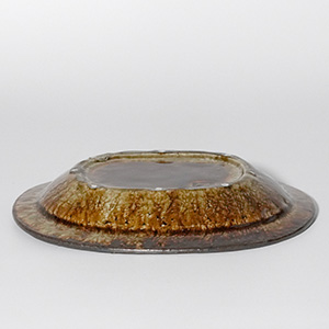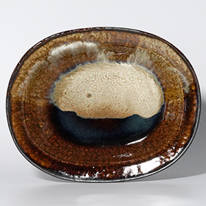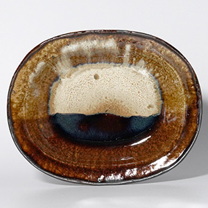 深みのある茶釉に白釉がやわらかく重なる、表情豊かな深型のオーバル皿です。