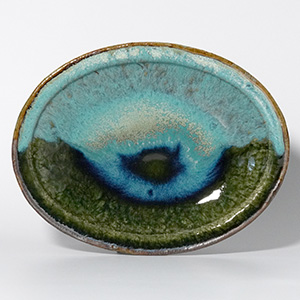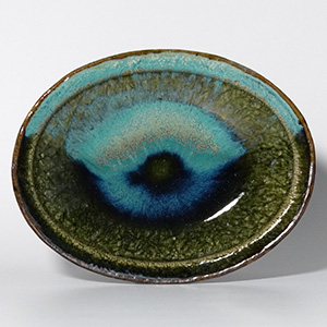 深みのある織部釉に白釉がやわらかく重なる、表情豊かなオーバル皿。