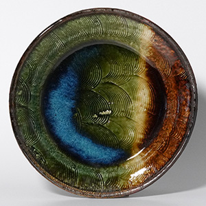 織部釉の透明感ある緑と、茶織部の温かな深みが美しく調和した掛分の深型リム皿。